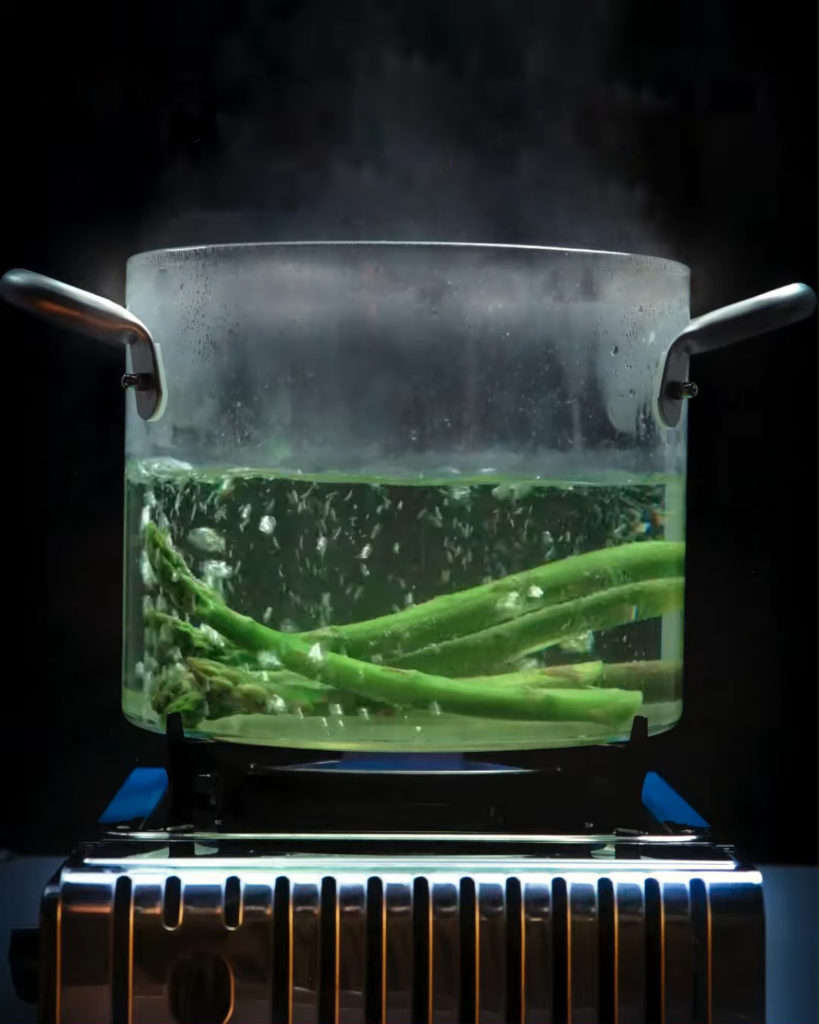 Gratin d’asperges, pommes de terre nouvelles, petits pois et brie, sauce rhubarbe